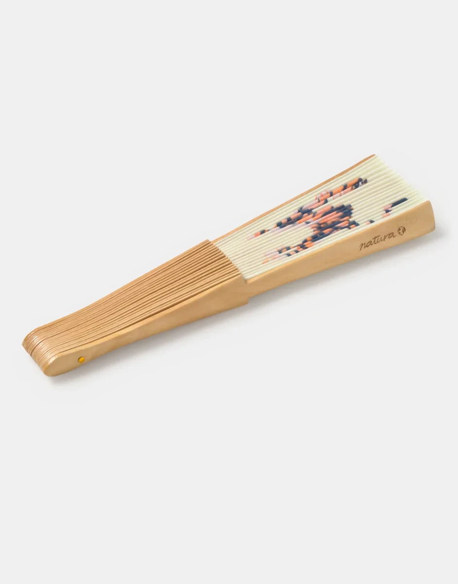 Abanico de madera con tela y diseño de Natura Retreat.