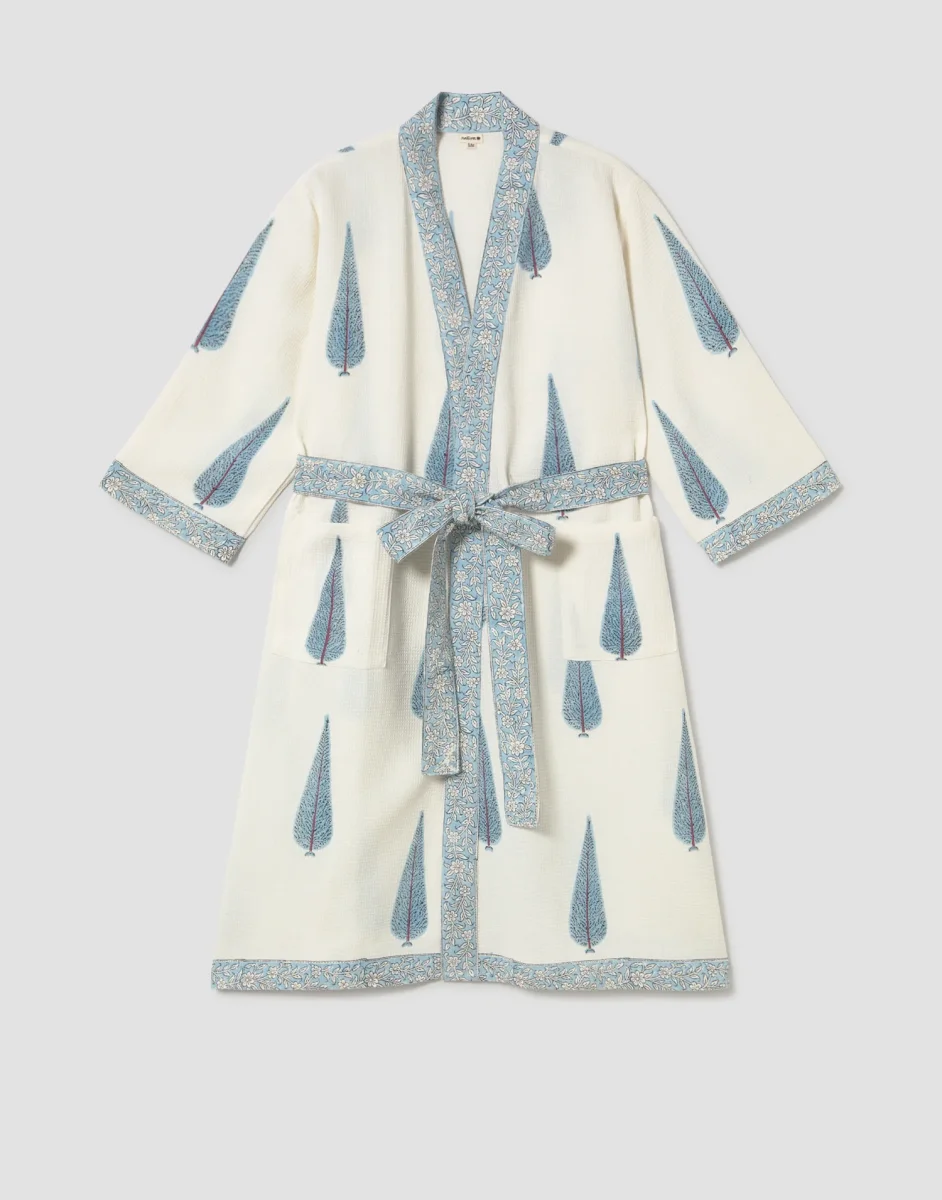 Albornoz confeccionado en algodón waffle con estampado de inspiración india, dos bolsillos delanteros y cinturón.
