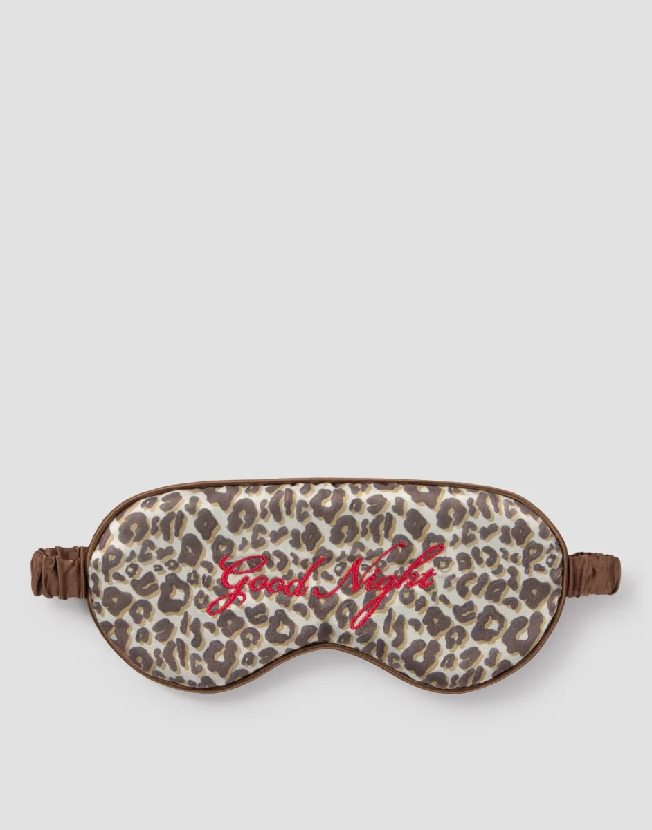 Antifaz con animal print y texto bordado en la parte exterior y acabado efecto seda en la parte interior. Ideal para tus viajes. Relájate y descansa sin interrupciones.