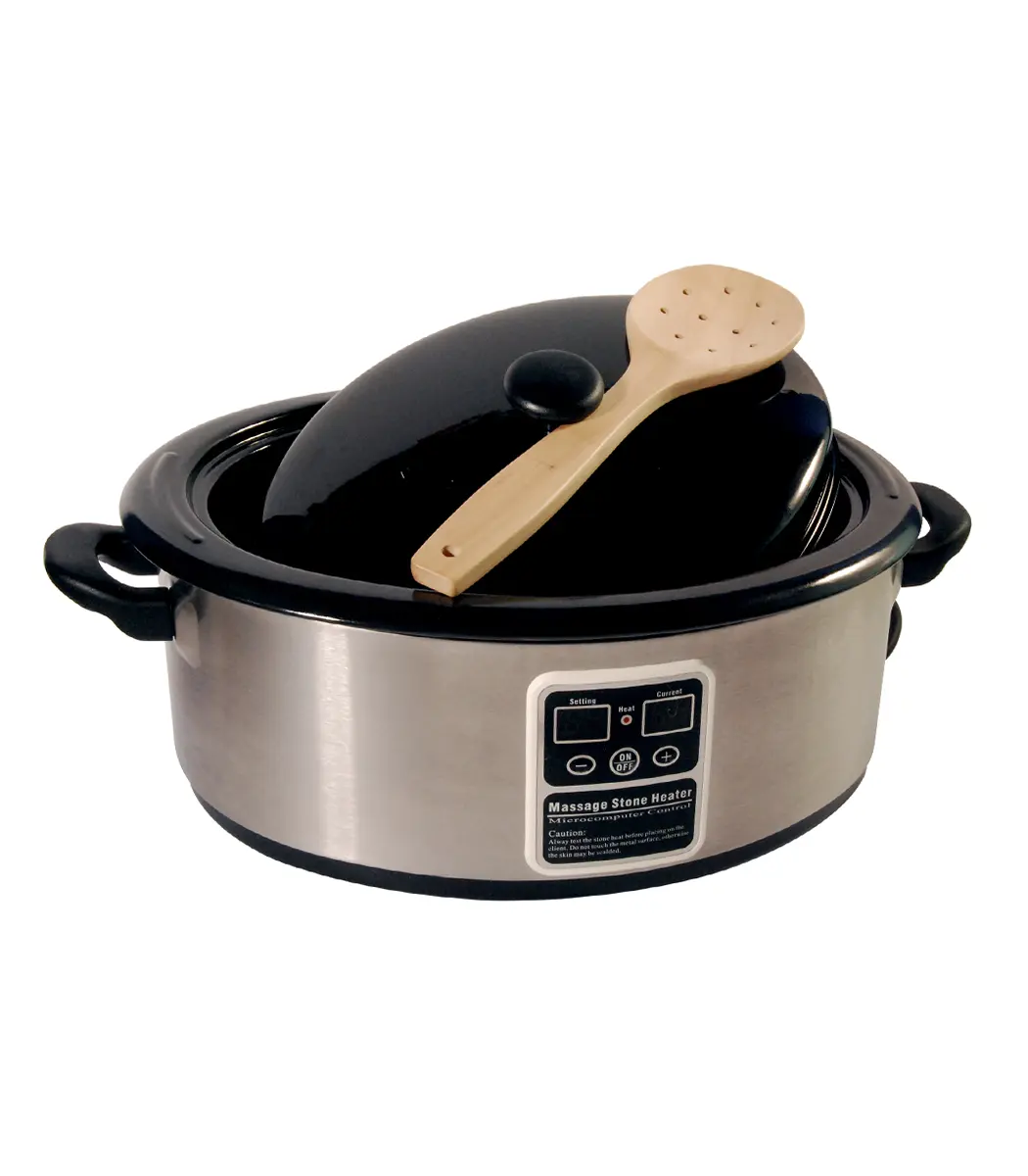 Cet appareil chauffe-pierres intègre un écran à affichage électronique pour le contrôle de la température de l’eau. L’appareil est fourni avec une cuillère en bois pour faciliter la récupération des pierres chaudes.