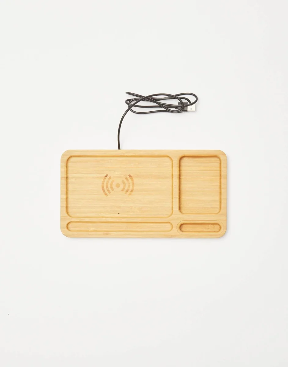 Elegante organizador de bambú con opción de carga inalámbrica para colocar tus llaves, móvil y otros objetos de manera ordenada.