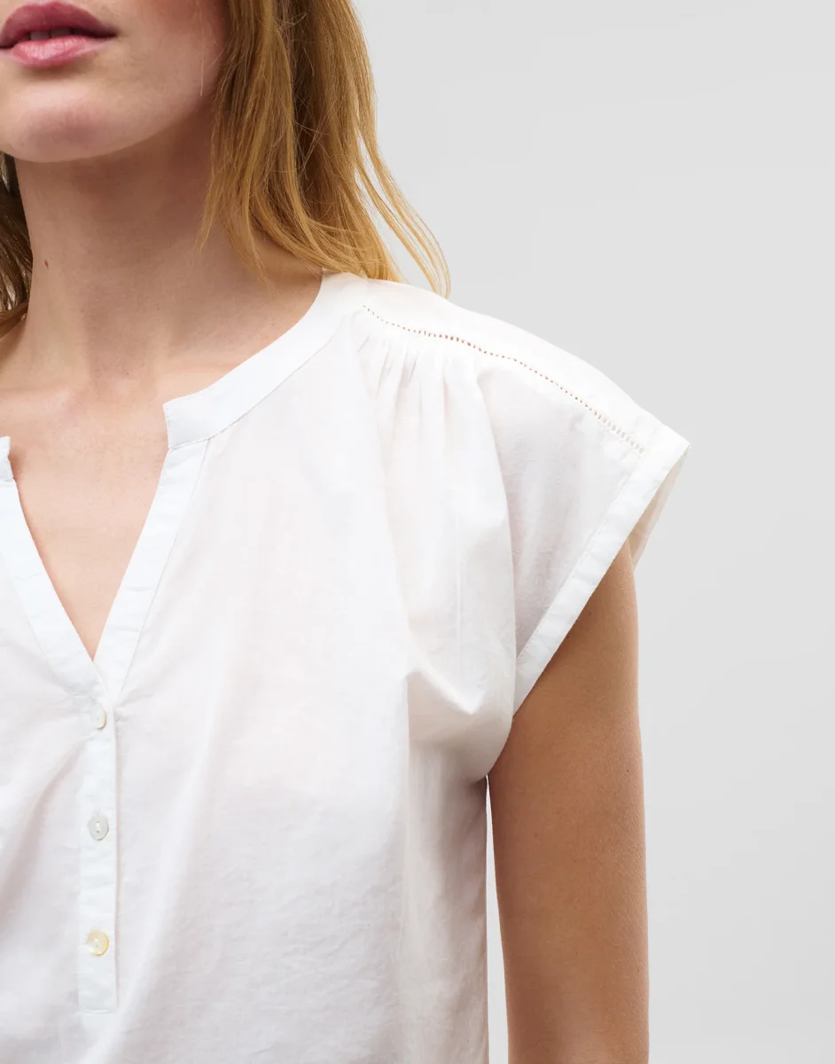 Blusa de manga corta con cuello de pico y cierre parcial de botones.
