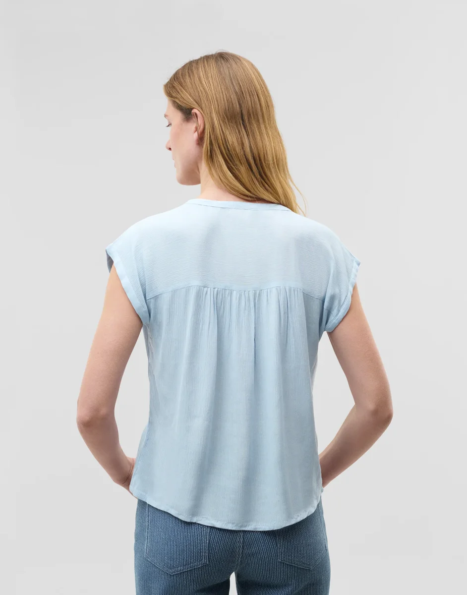 Blusa de manga corta con cuello de pico y cierre de botón en la parte frontal.