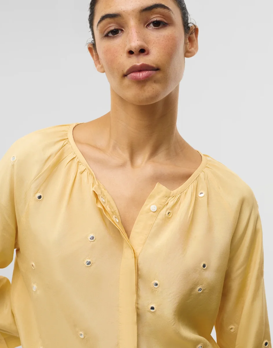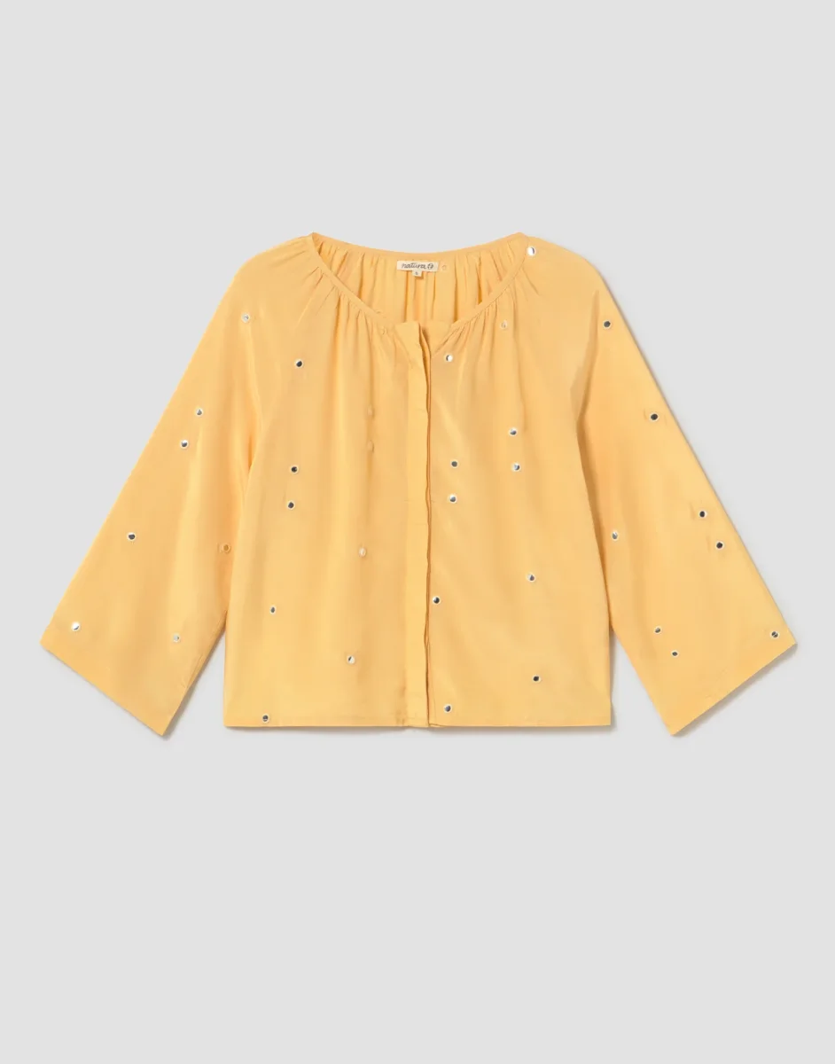 Blusa de manga por debajo del codo y cuello redondo. Cierre frontal de botones ocultos y detalle de espejos bordados. Acabado efecto seda.