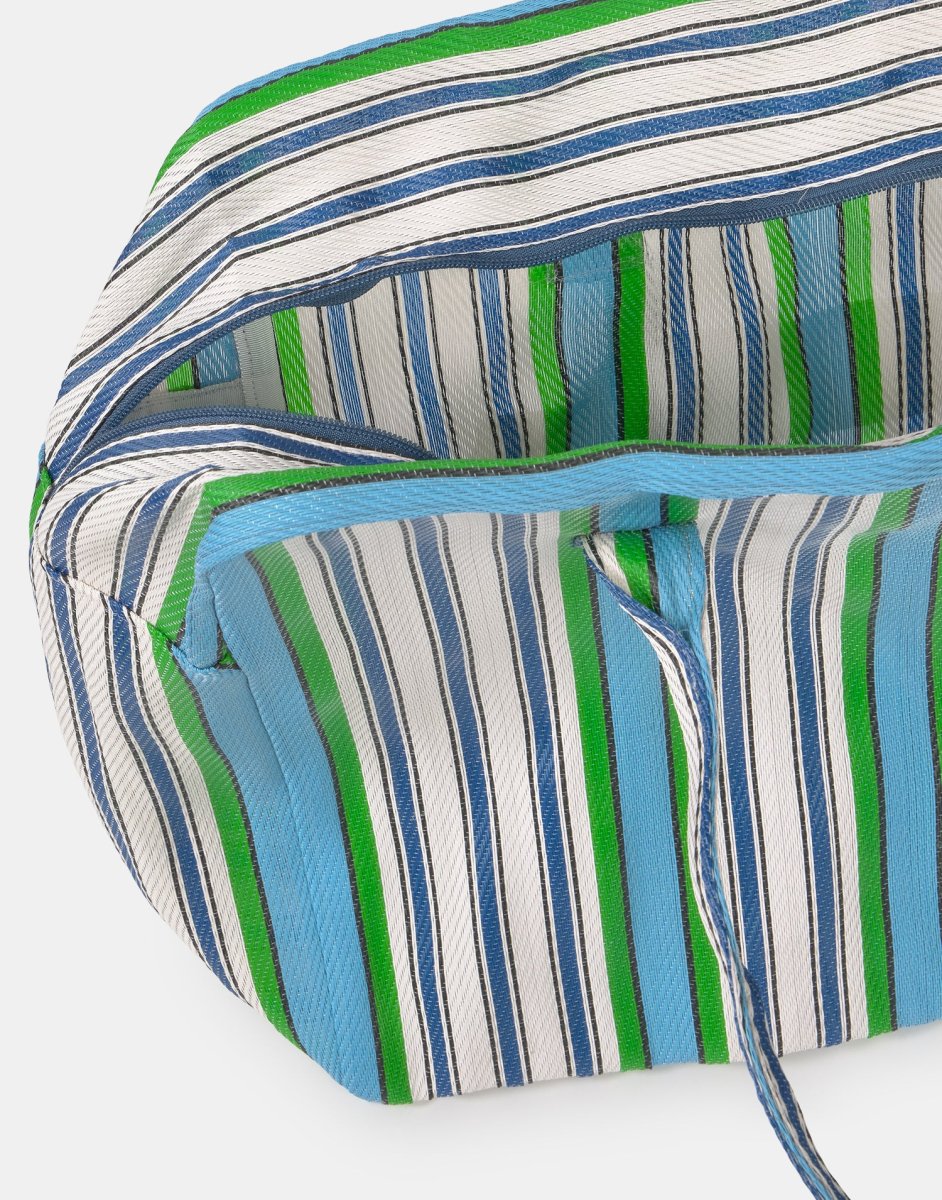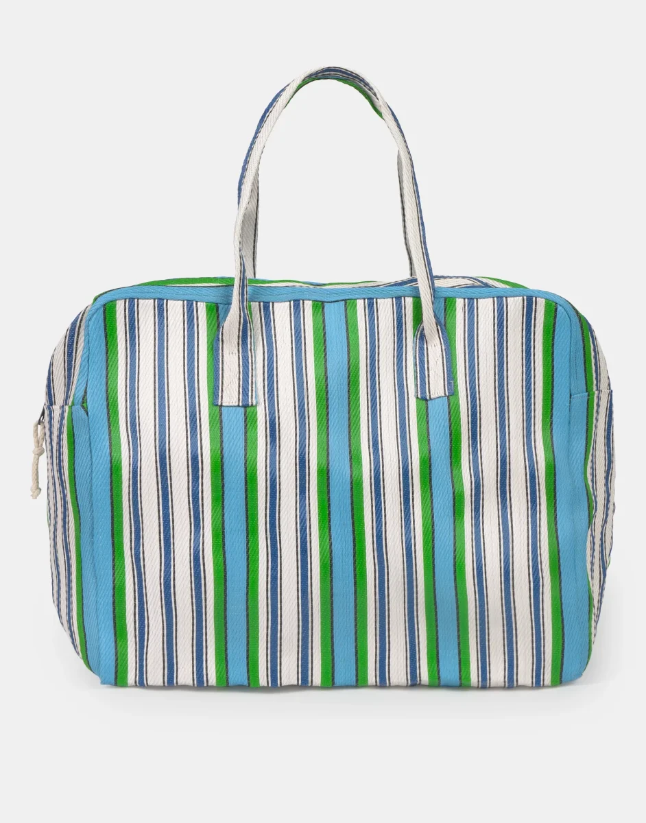 Bolsa grande a rayas, inspirada en las tradicionales bolsas indias de almacenaje. Con doble asa para llevar al hombro y cierre de cremallera. Puedes usarla para almacenar, como bolsa de fin de semana o bolsa de playa.