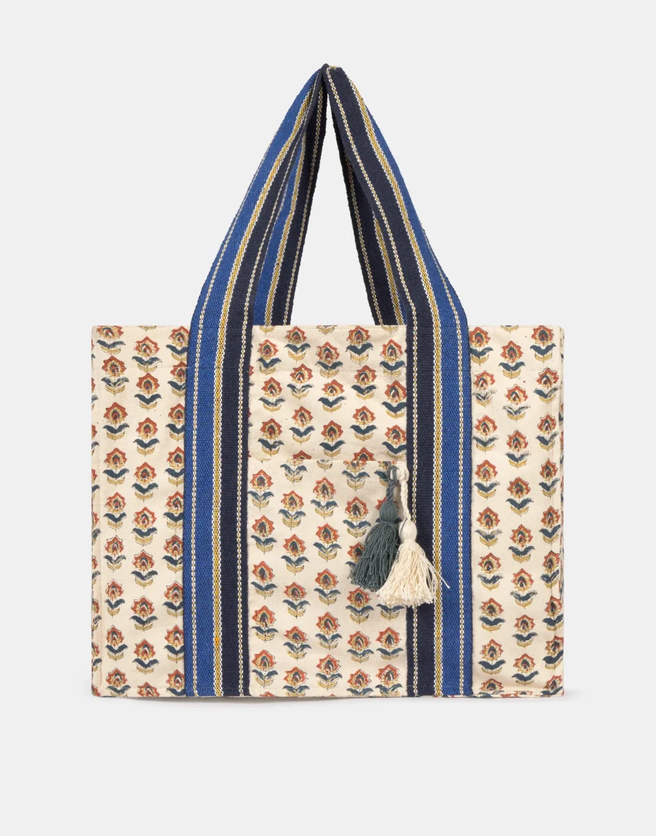 Bolsa de algodón estampada con técnica block print, dos asas y cierre de imán. Bolsillo exterior en la parte frontal y detalle de dos pompones.