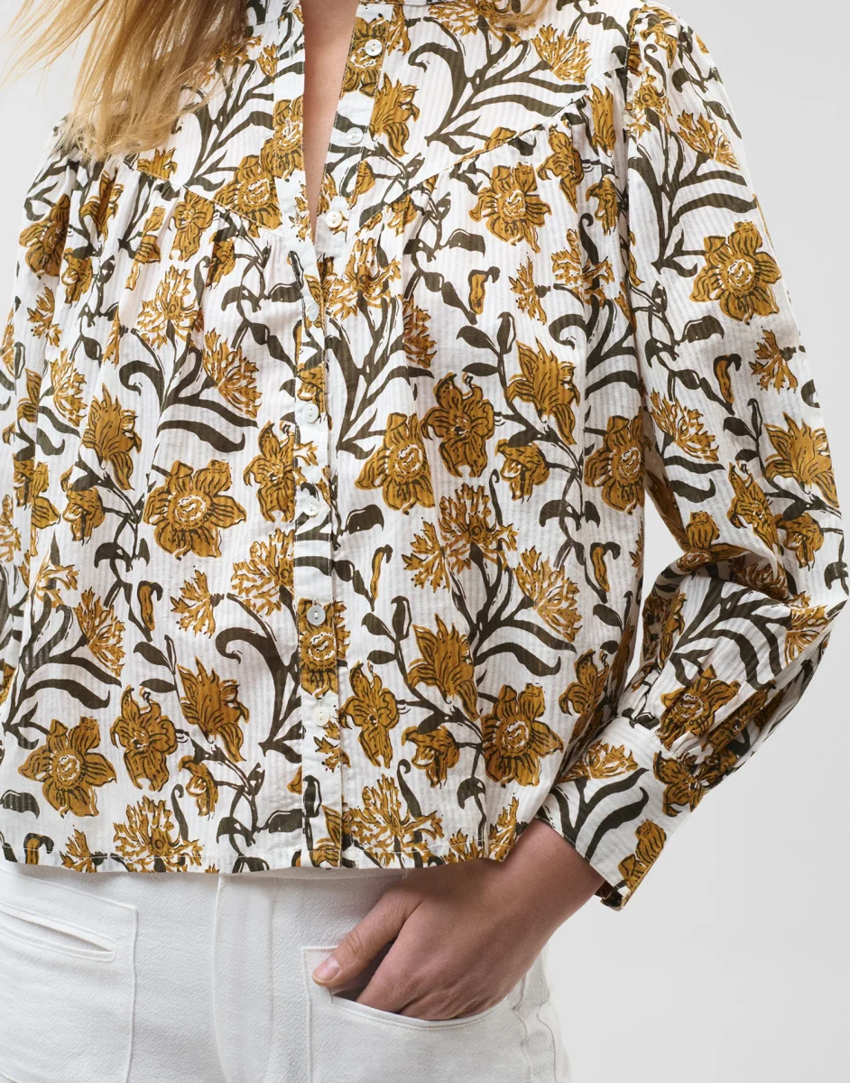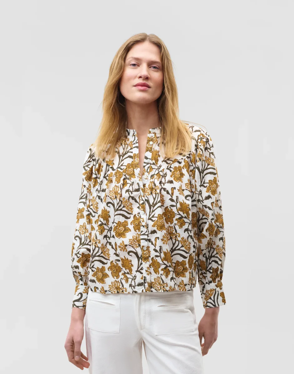 Blusa de manga larga acabada en puño abotonado y cuello redondo. Estampado floral.