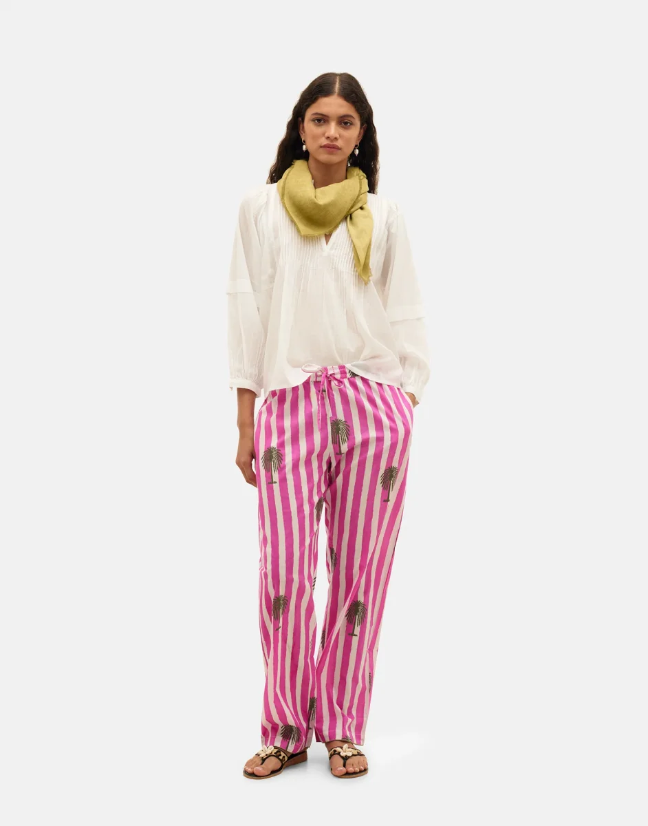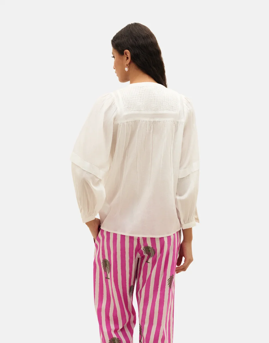 Blusa de manga larga y escote de pico. Con detalles plisados y puños abotonados.