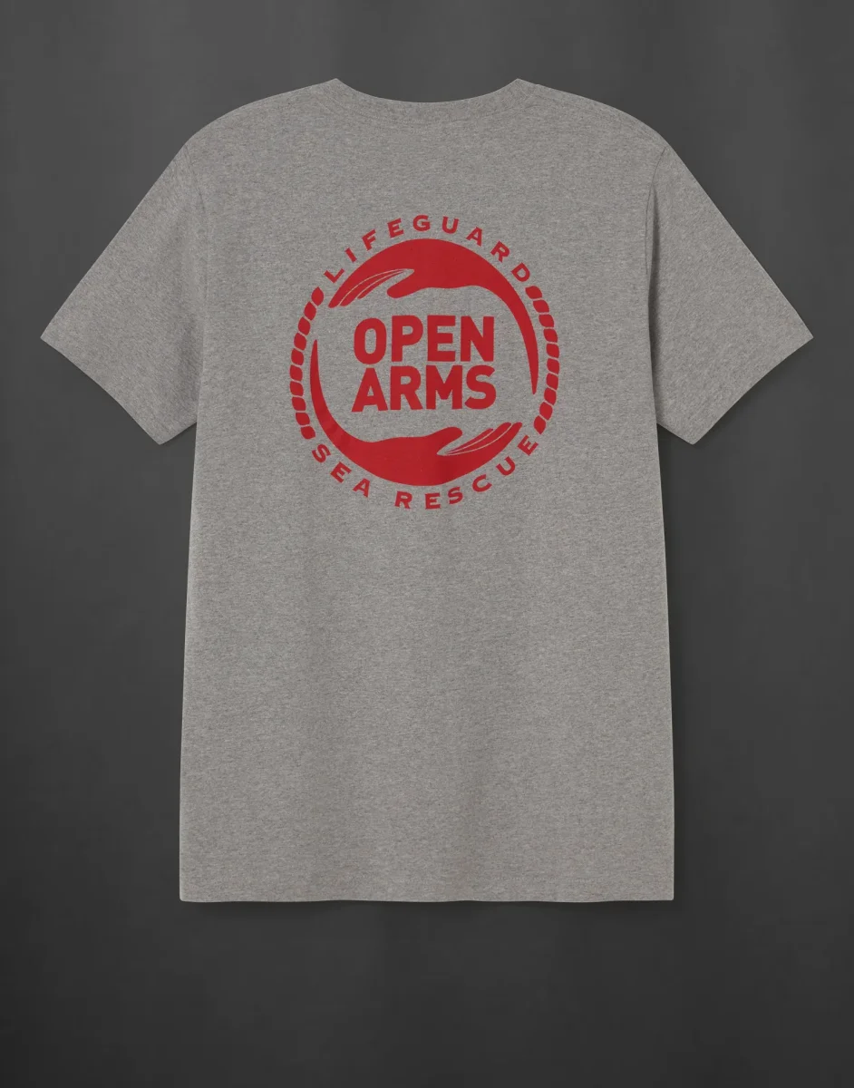 Camiseta unisex de manga corta de color gris con la palabra Open Arms en la parte delantera y el logo en rojo en la parte trasera.