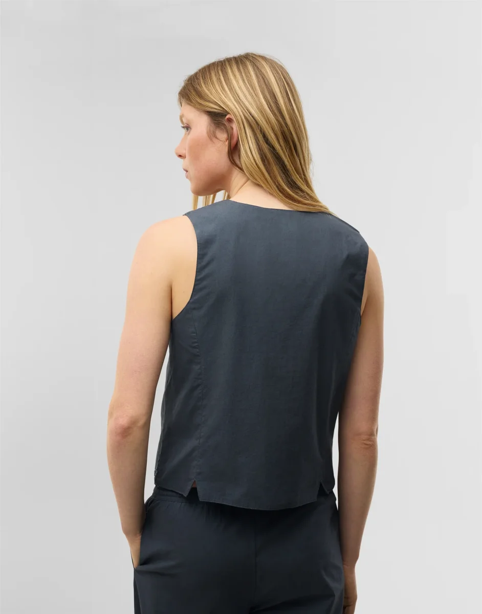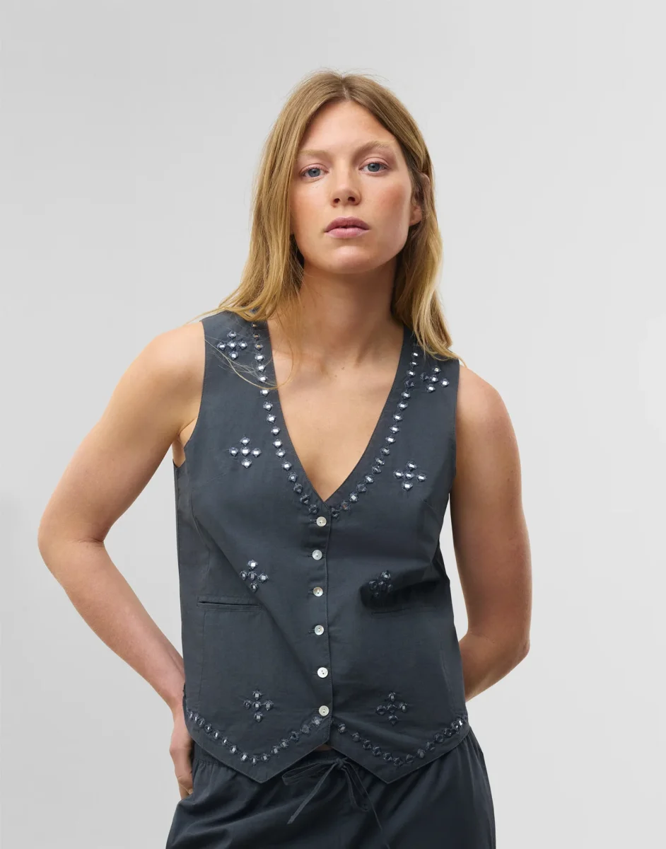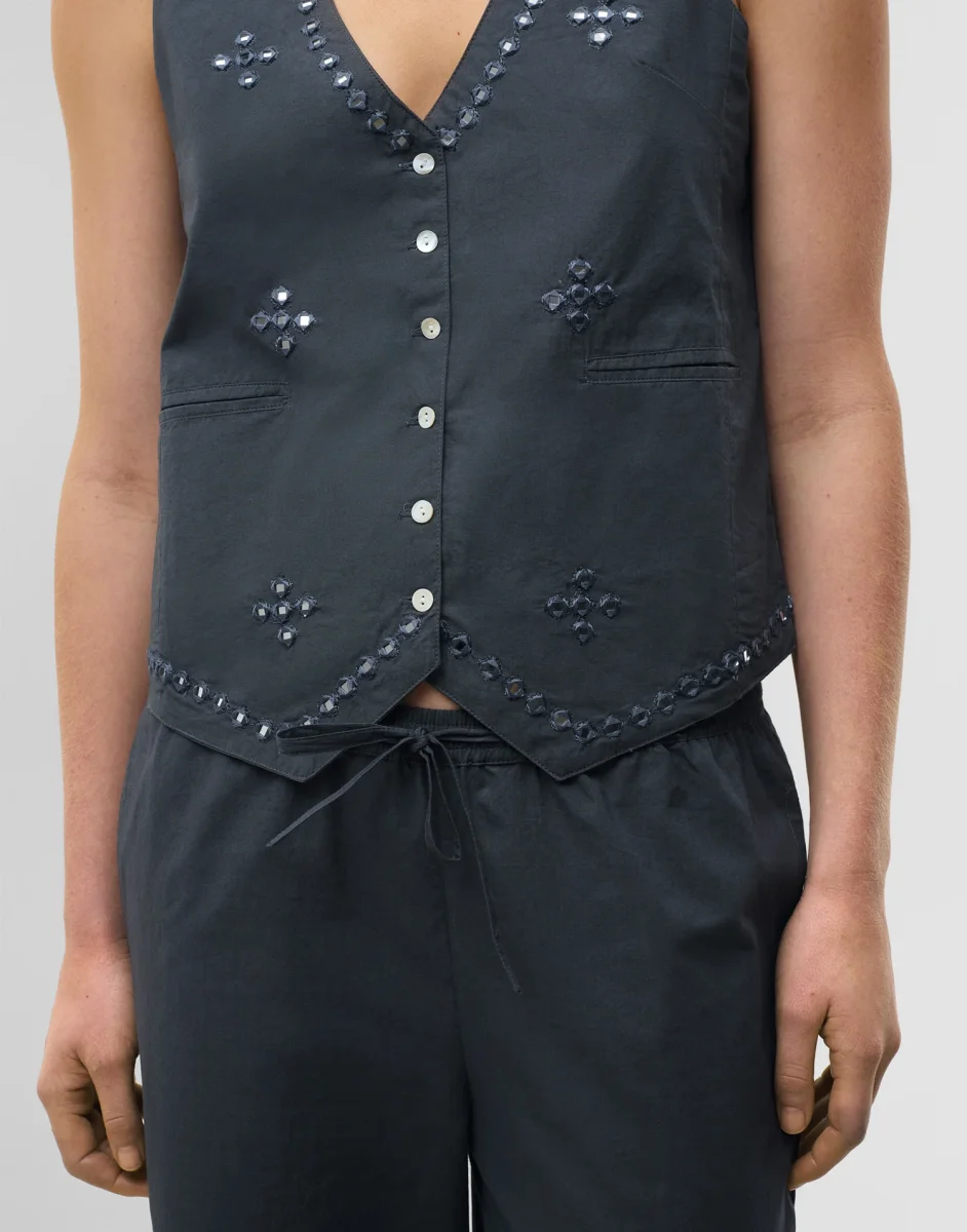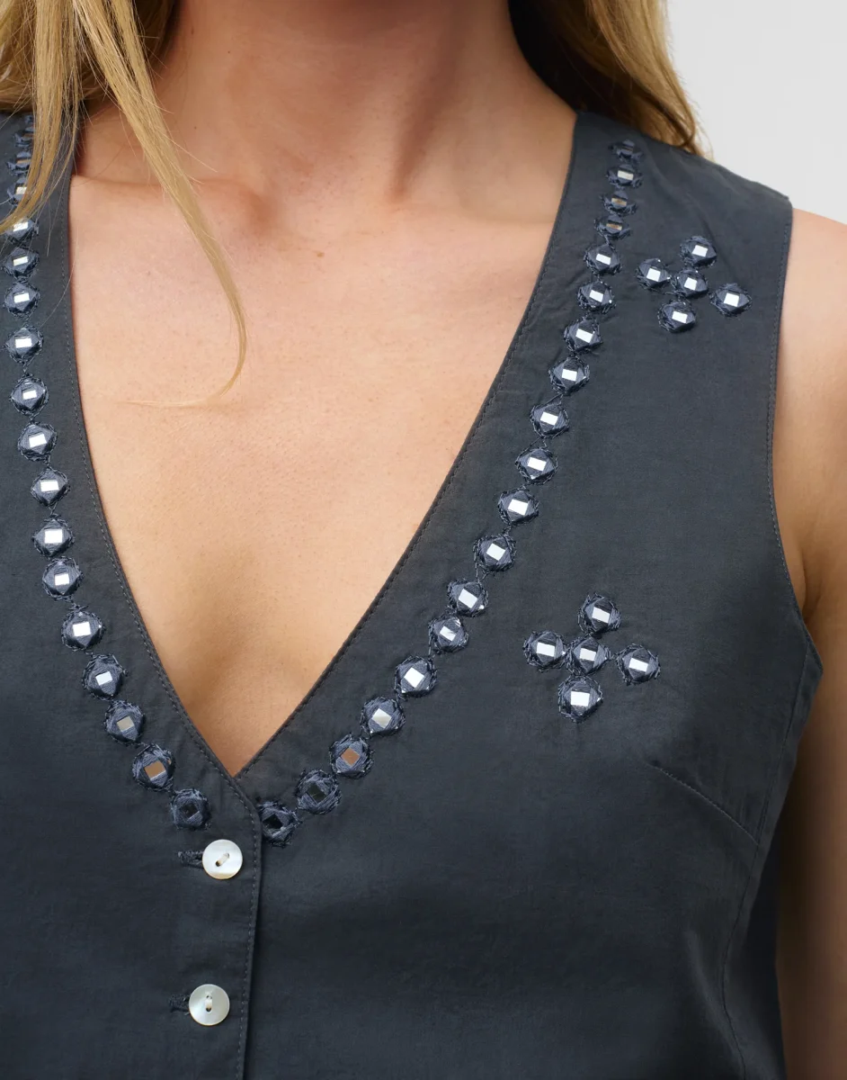 Top de manga sisa, escote de pico y cierre frontal con botones. Acabado con detalle de espejos en la parte frontal.