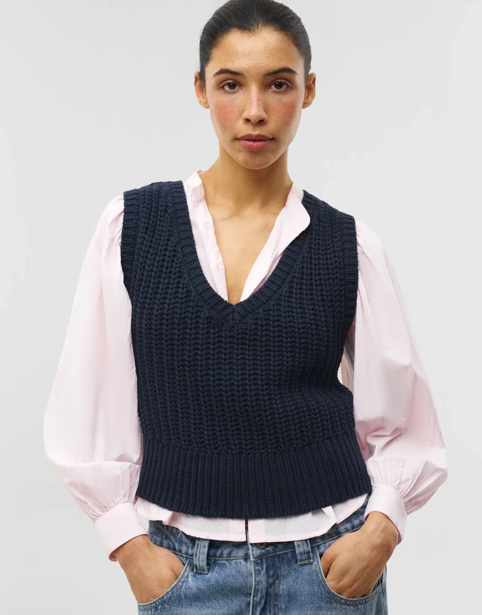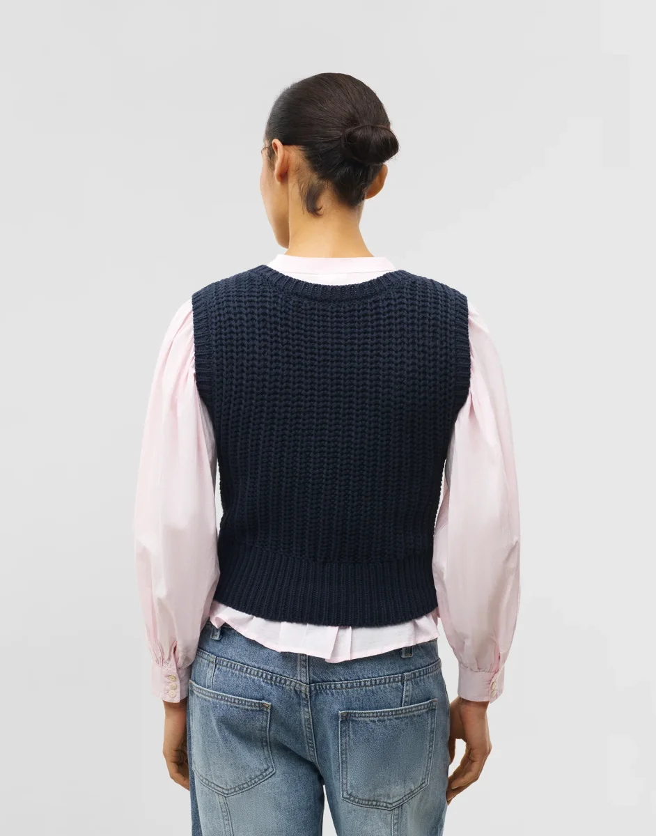 Chaleco de punto con cuello de pico y manga sisa.