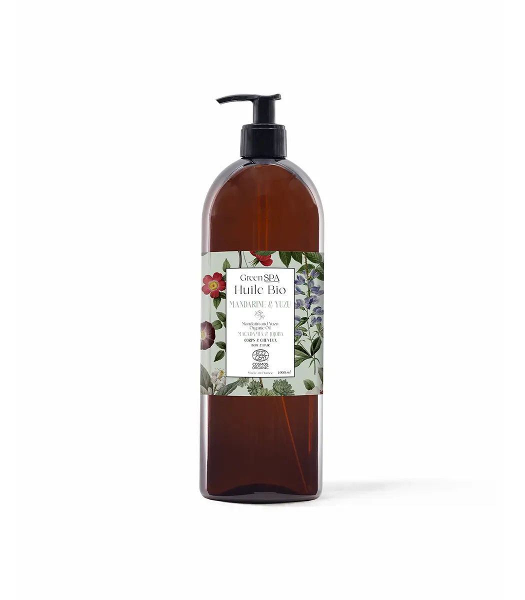 Découvrez l’huile de massage naturelle Mandarine & Yuzu – 1 L (BIO) : l’élixir estival qui transcende vos soins