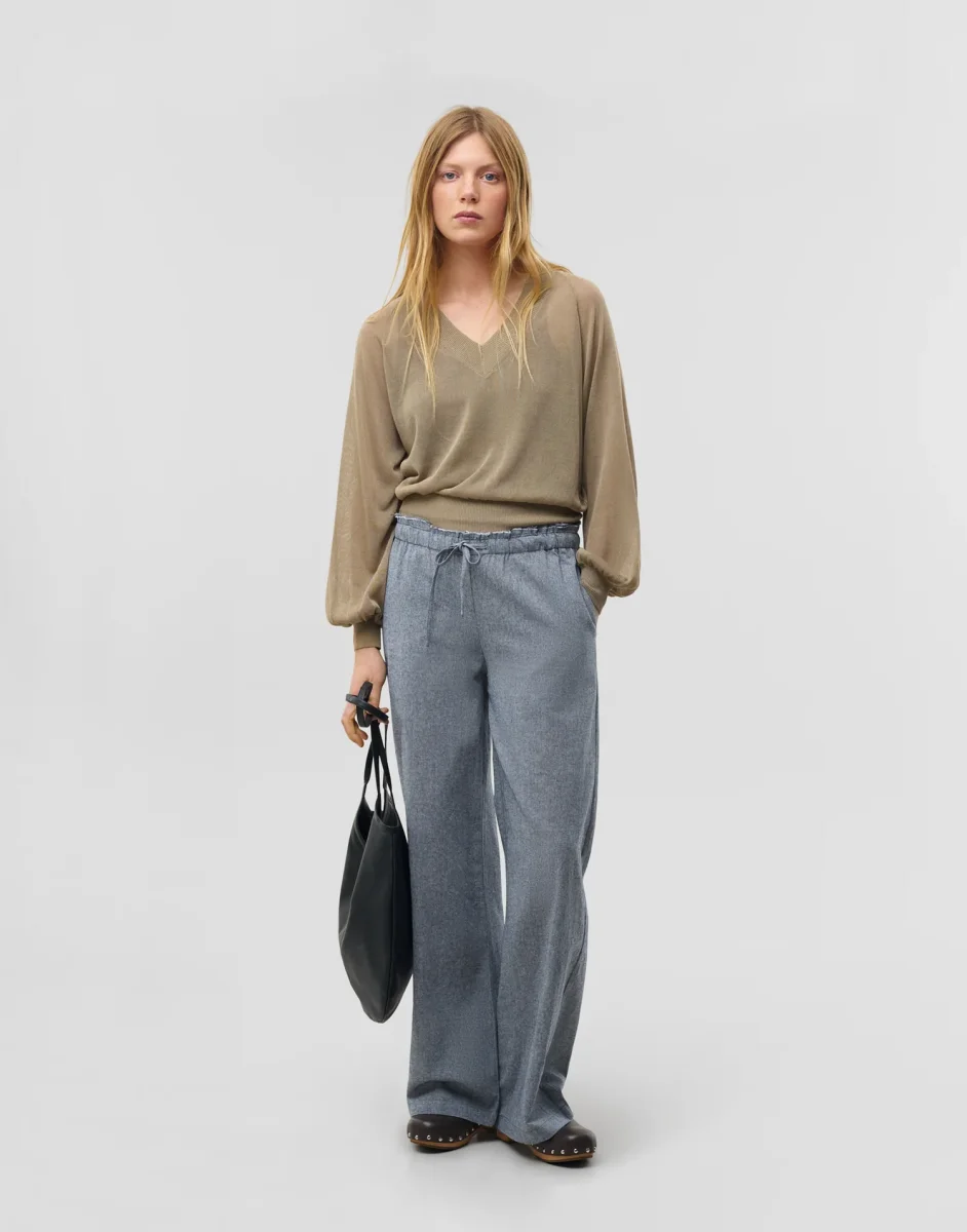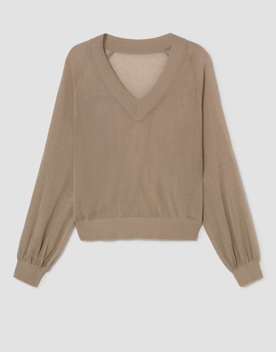 Jersey de punto fino con escote de pico. Manga larga acabada en puño.