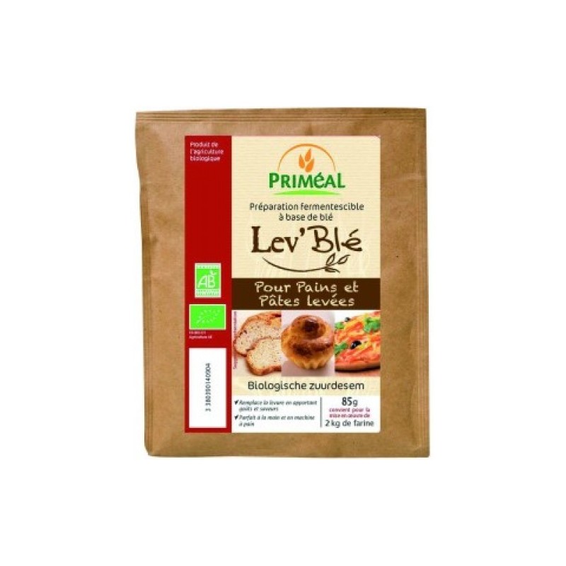 Cette préparation fermentescible à base de blé est élaborée à partir d’un véritable levain, c’est à dire d’un mélange d’une farine bio et d’eau mis en fermentation, ce qui permet de développer des levures sauvages ainsi que les saveurs typiques d’un pain au levain. Le levain est ensuite déshydraté à basse température et additionné d’un faible pourcentage de levure qui jouera un rôle de starter au moment de la levée de la pâte.