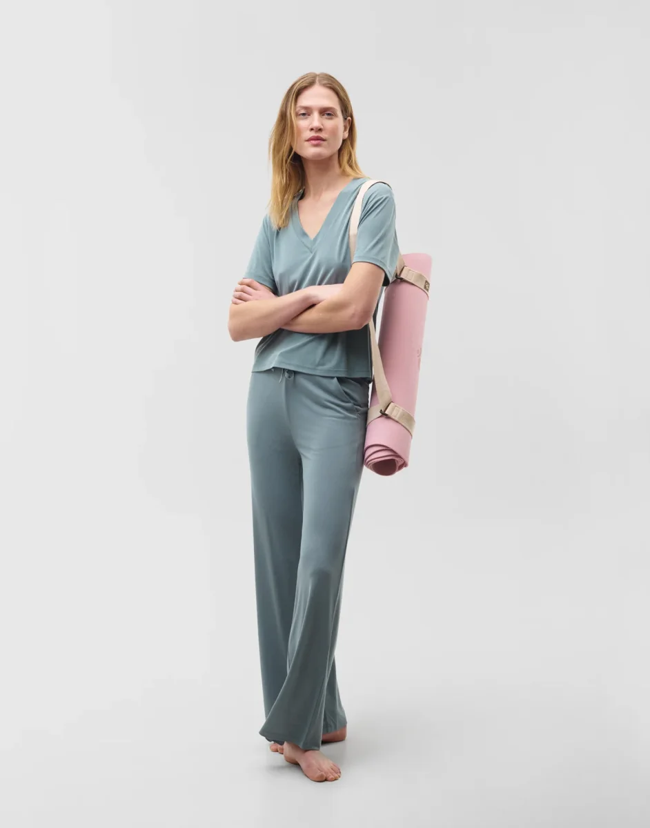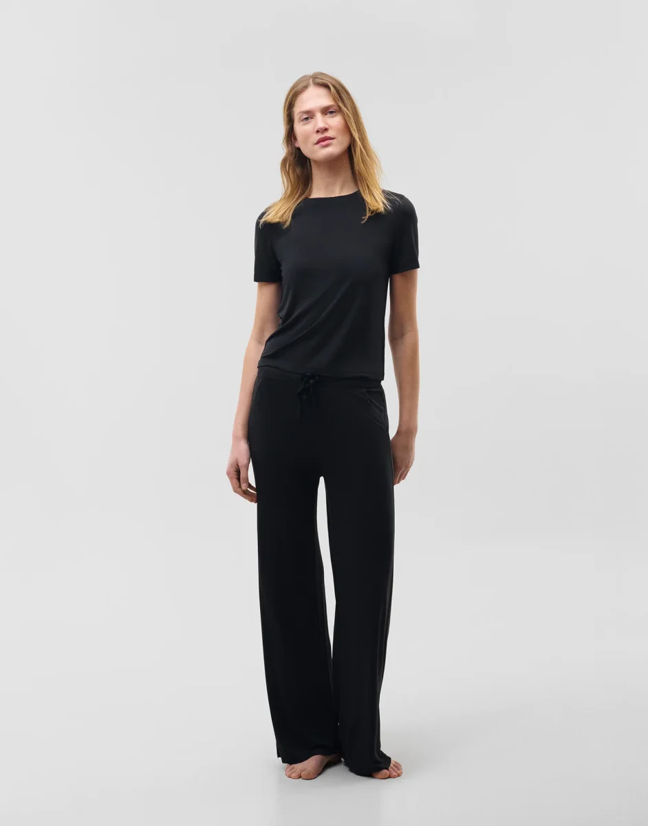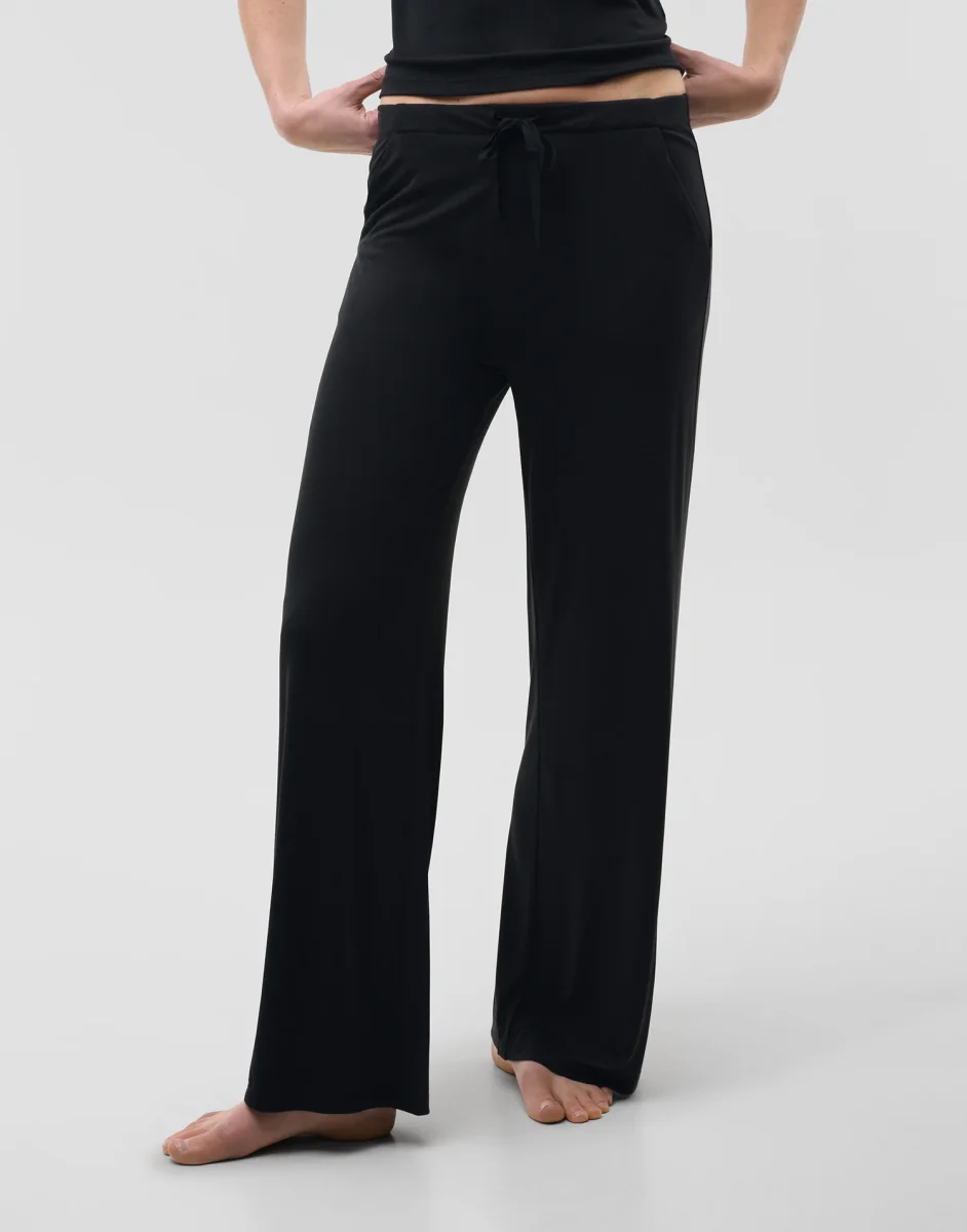 Pantalón de corte recto y tejido elástico. Acabado con bolsillos laterales y cintura ajustable con cordón.