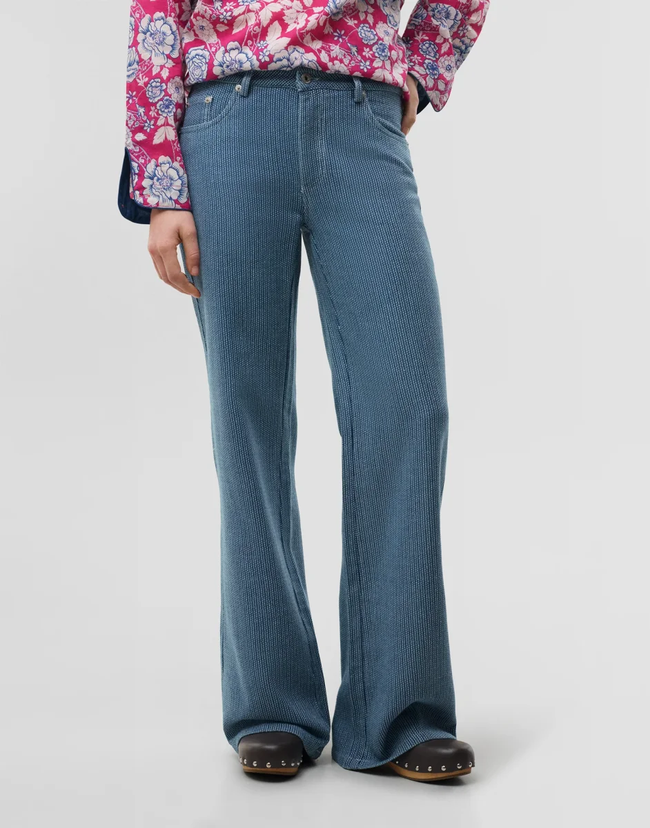 Pantalón tejano con pierna recta, bolsillos laterales y bolsillos de plastrón en espalda. Cintura con trabillas y cierre frontal con cremallera y botón.