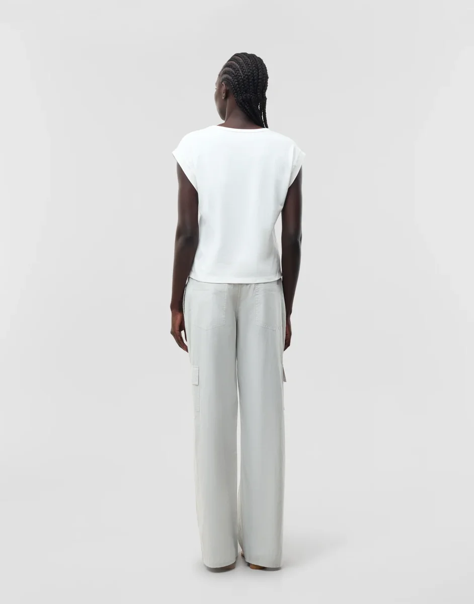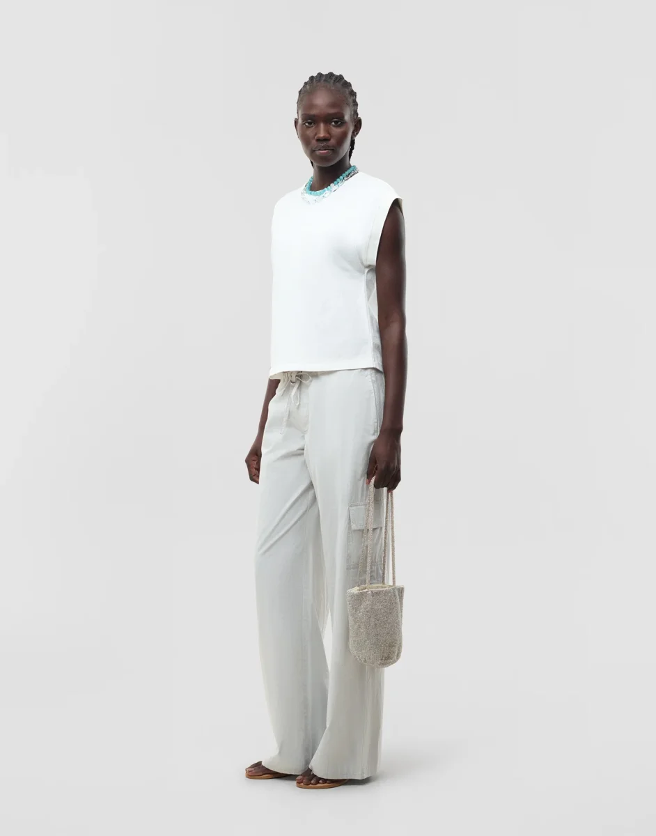 Pantalón de corte recto en algodón 100%. Bolsillos delanteros y bolsillos de plastrón en los laterales y en espalda. Cintura ajustable mediante cordón.