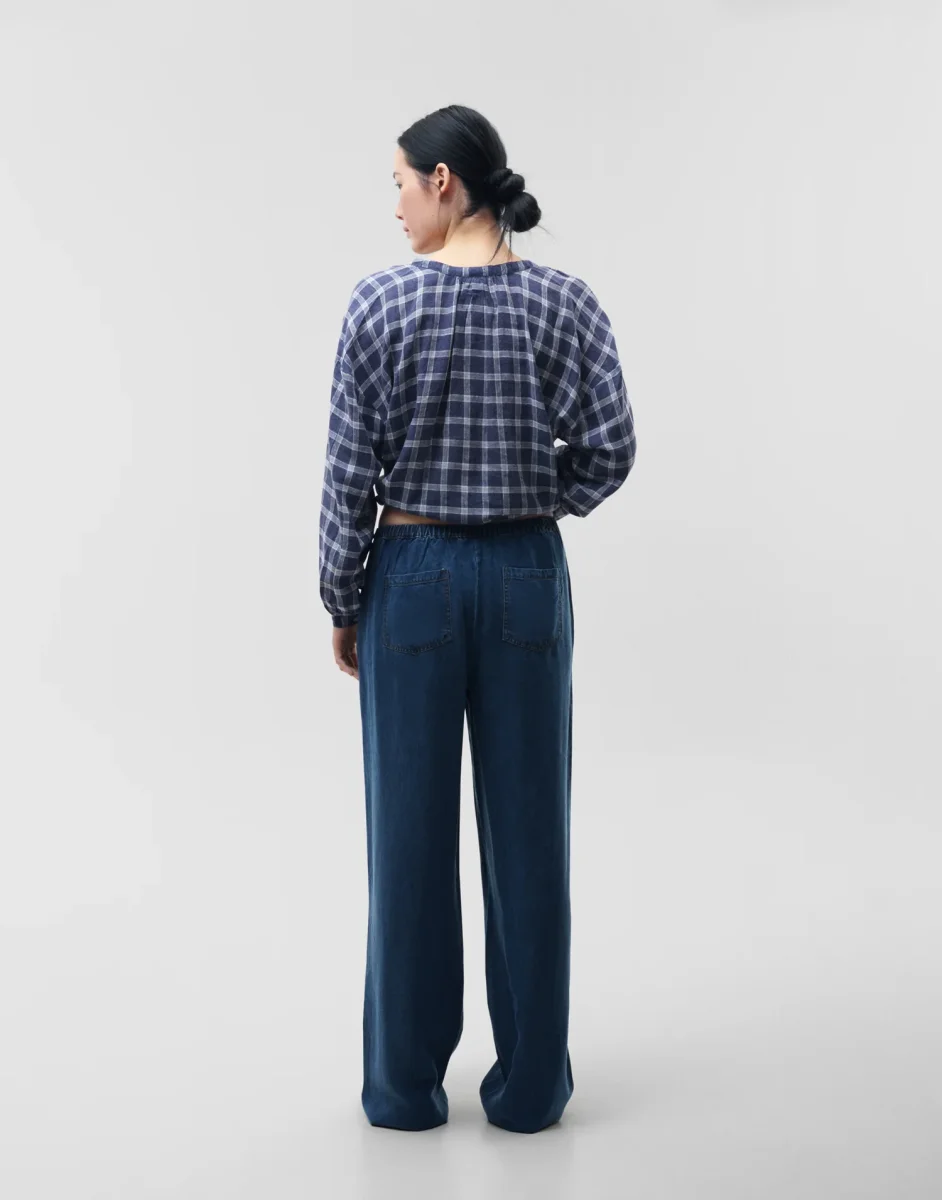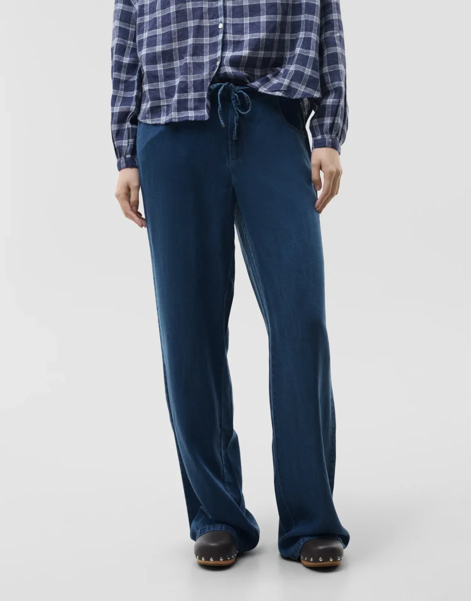 Pantalón recto en tejido de lyocell, con acabado efecto denim y cinco bolsillos. Cierre frontal con cremallera y lazo ajustable. Cintura elástica en la parte trasera.