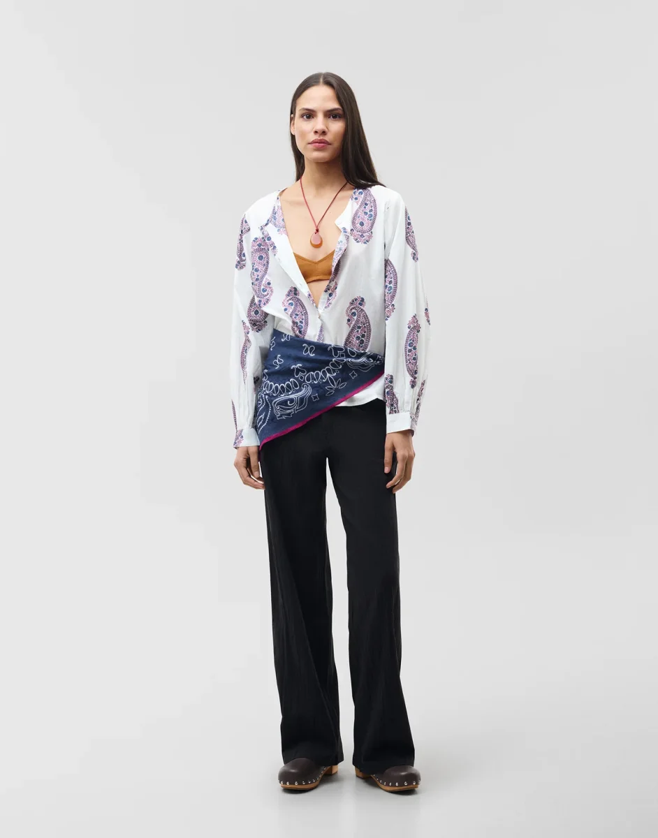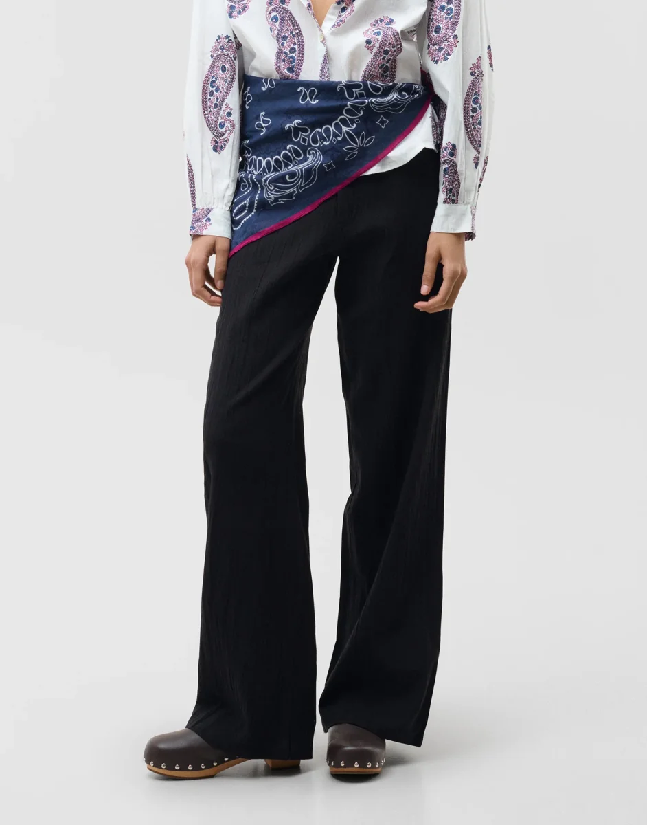 Pantalón recto confeccionado en mezcla de algodón y lino con cintura elástica en la parte trasera. Bolsillos laterales y bolsillos de plastrón en espalda.