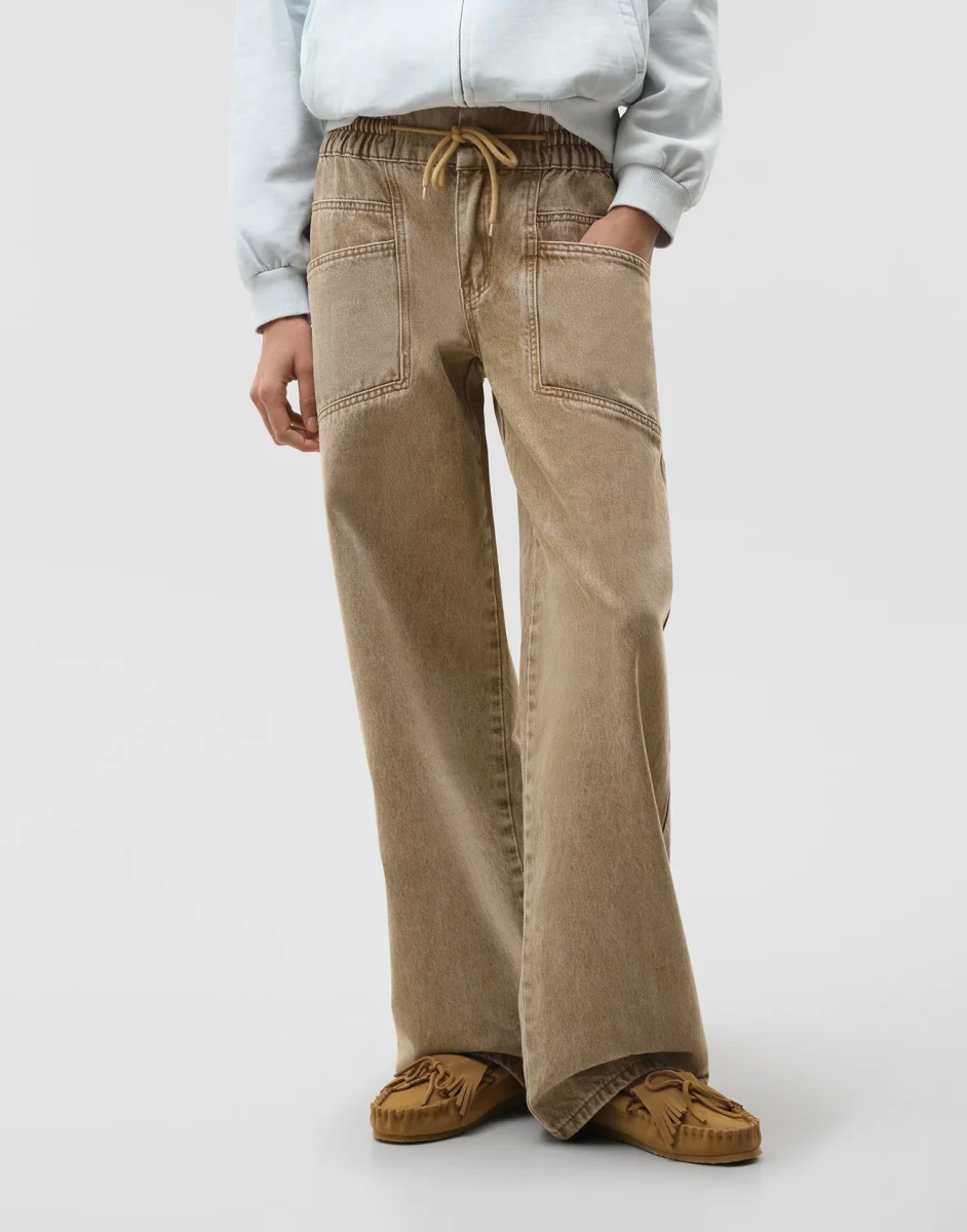 Jeans rectos de tiro medio, con cuatro bolsillos y detalle de costuras desplazadas. Cintura elástica ajustable con cordón y cierre de botón.