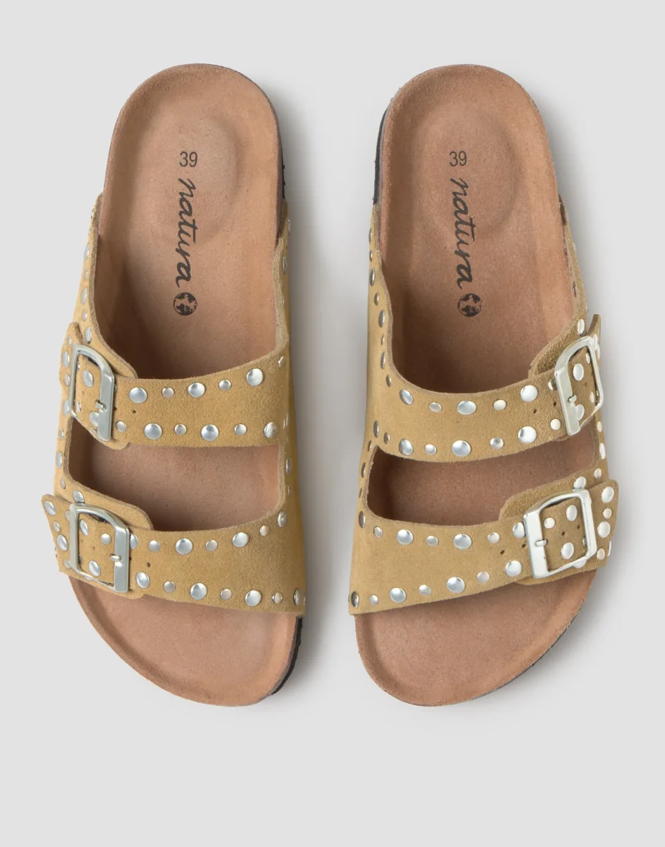 Sandalia ergonómica con doble tira en piel, detalle de hebilla ajustable, tachuelas y suela de corcho.