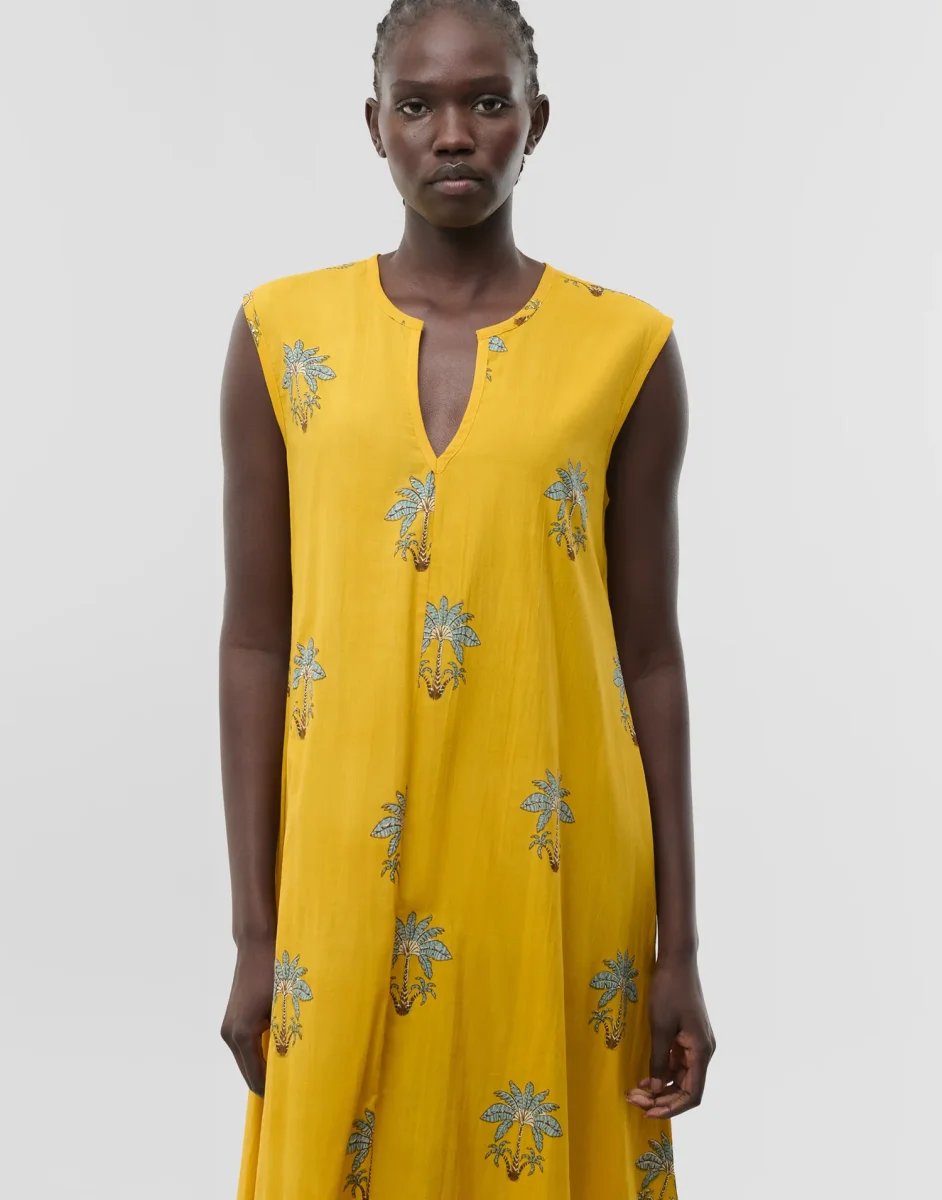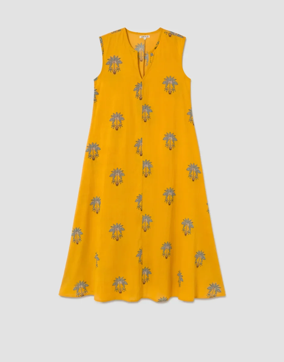 Vestido largo estilo túnica, sin mangas y con escote de pico.