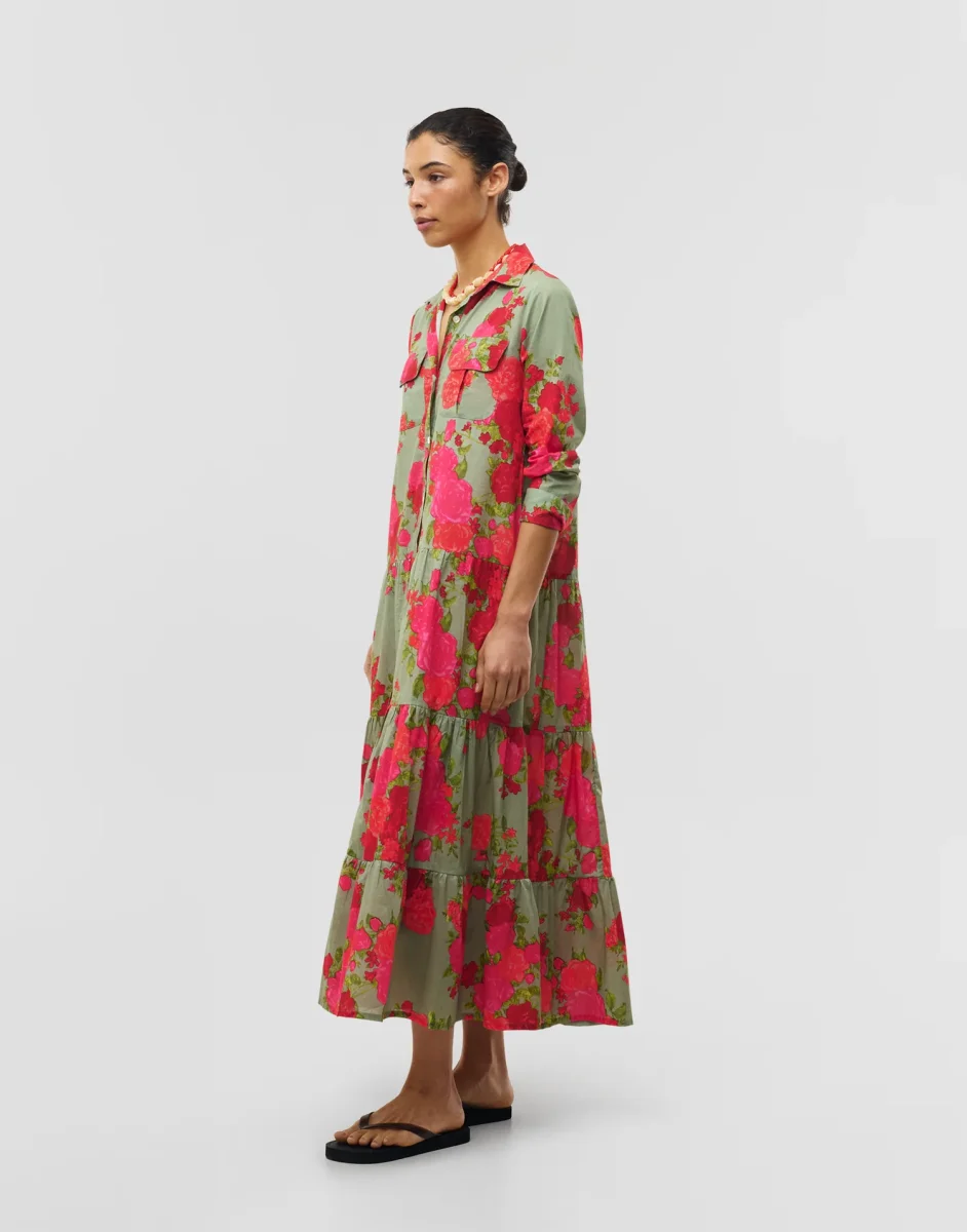 Vestido floral de manga larga, cuello solapa y cierre frontal de botones. Bolsillos de plastrón en la parte frontal y cinturón a tono.