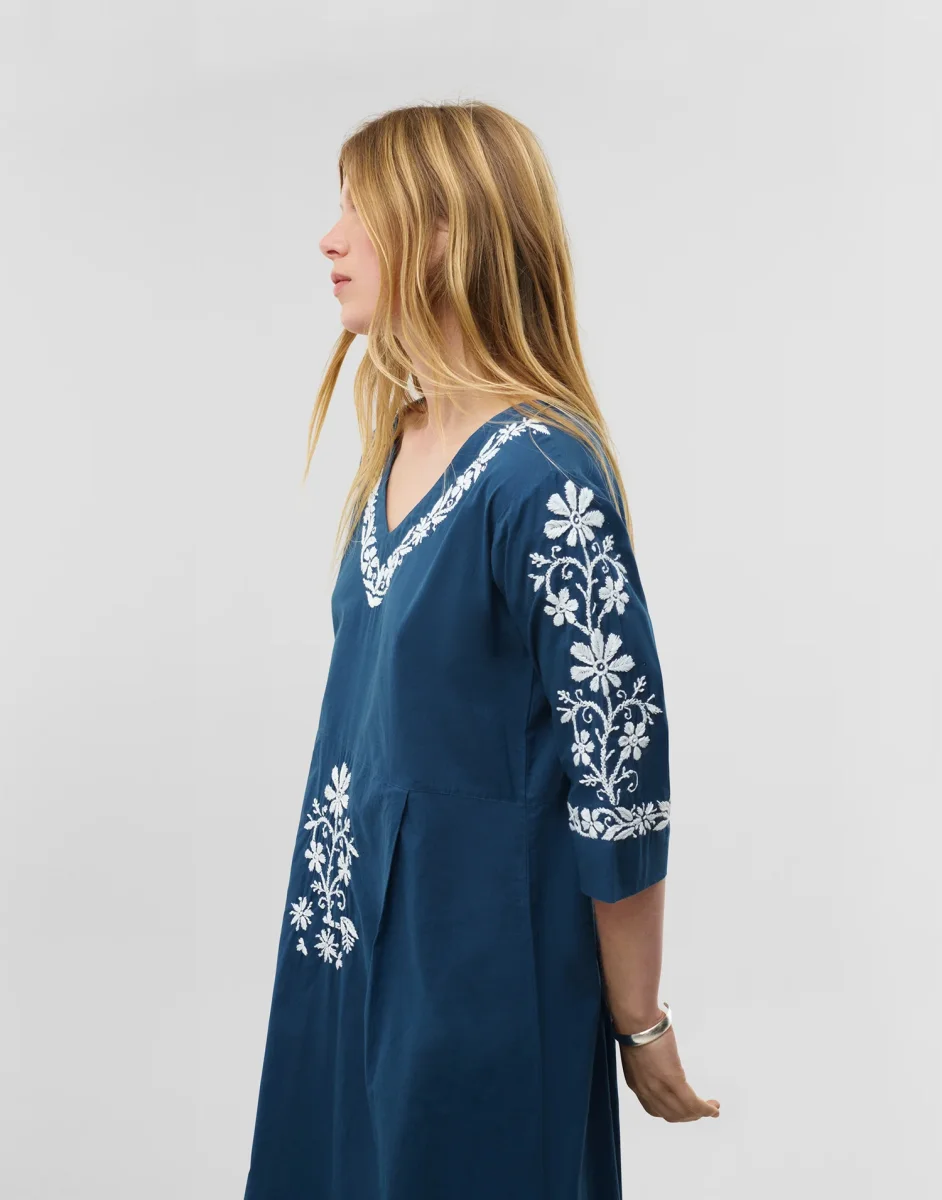 Vestido largo confeccionado en algodón con detalles bordados. Manga por debajo del codo y cuello pico.