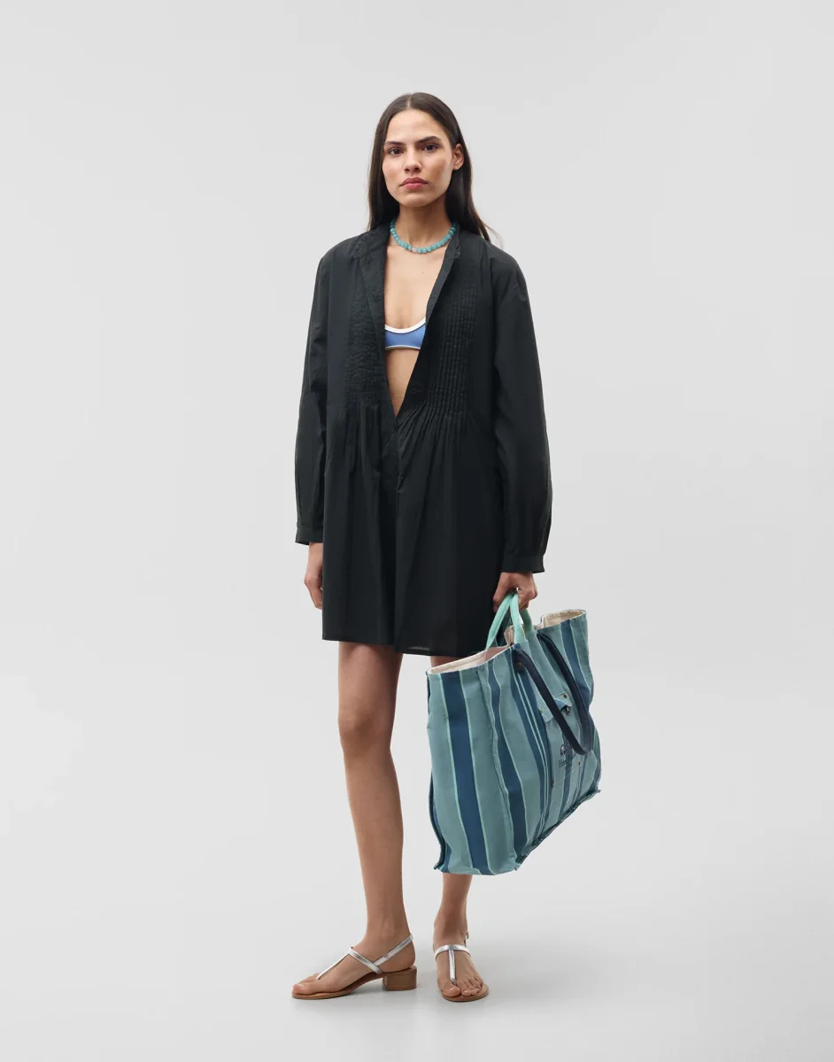Vestido corto con bolsillos laterales, manga larga y pliegues en delantero. Cuello mao acabado con detalle de volante. Cierre frontal de botones.