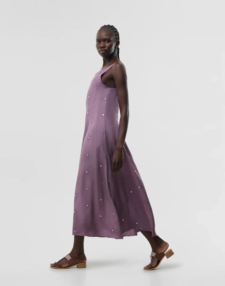 Vestido largo con tirantes y escote redondo. Detalle de espejos bordados.