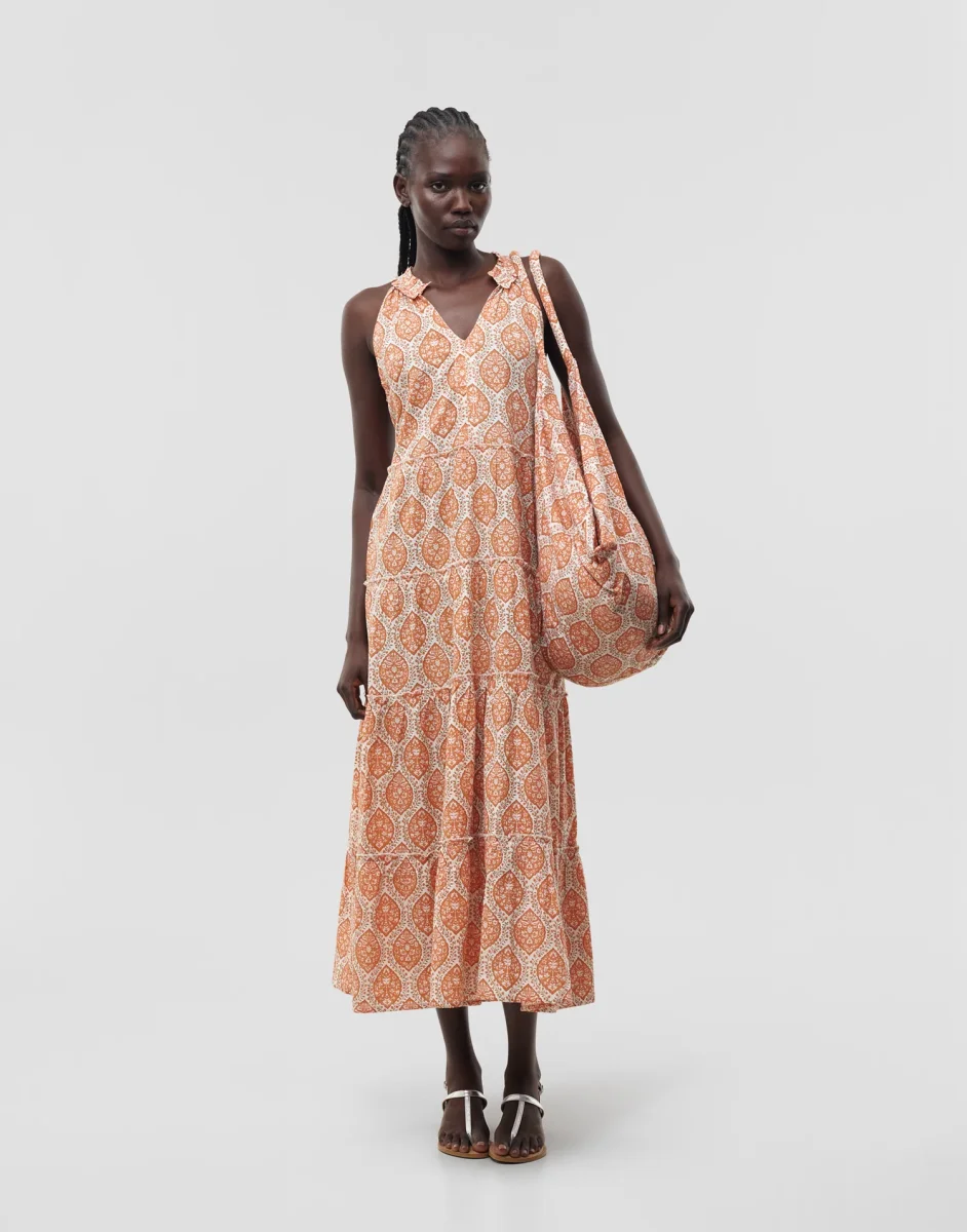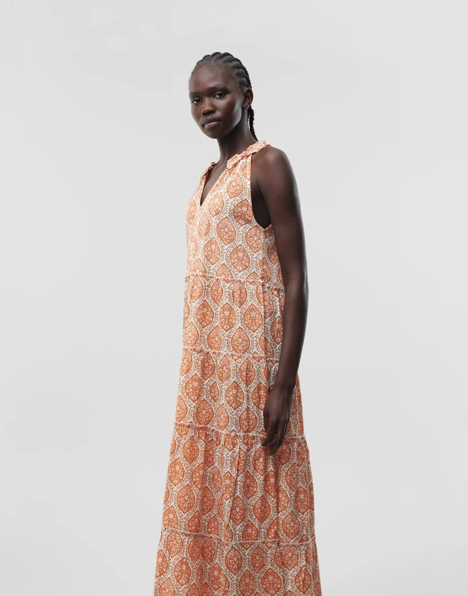 Vestido largo sin mangas, con escote de pico, estampado floral y detalle de volantes.