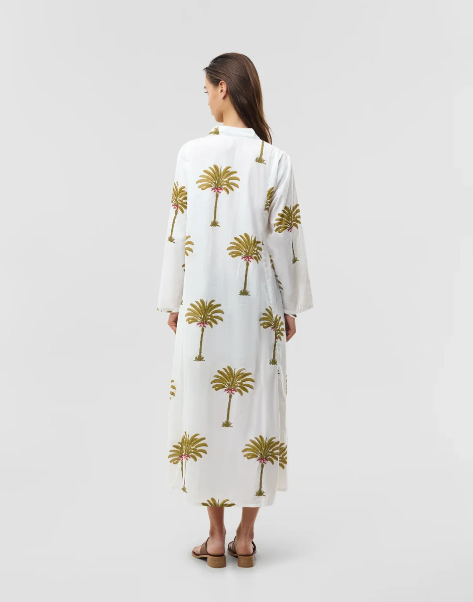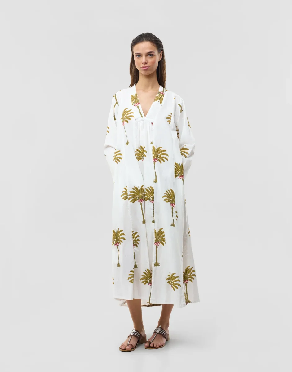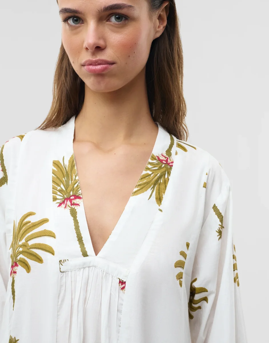 Vestido estampado estilo túnica, con bolsillos laterales, manga larga y escote de pico.