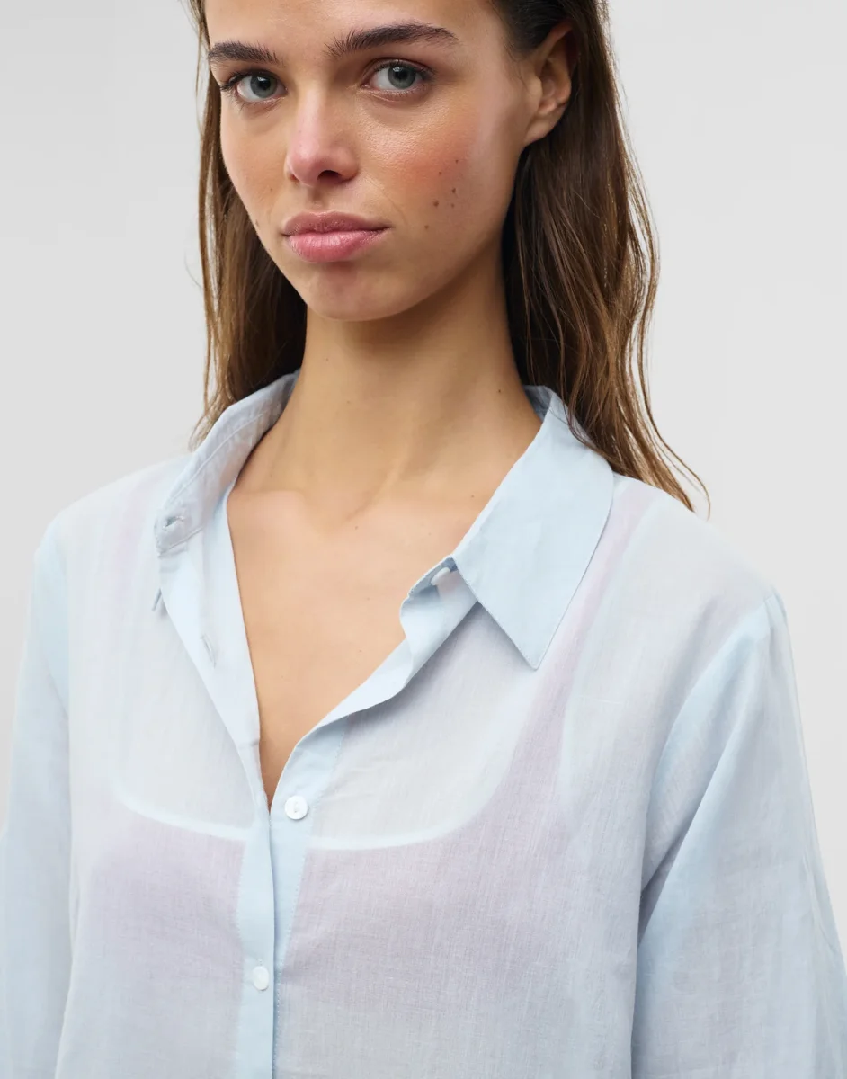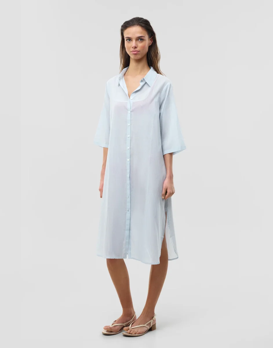 Vestido camisero estilo túnica con cuello solapa, manga por debajo del codo y cierre frontal de botones.