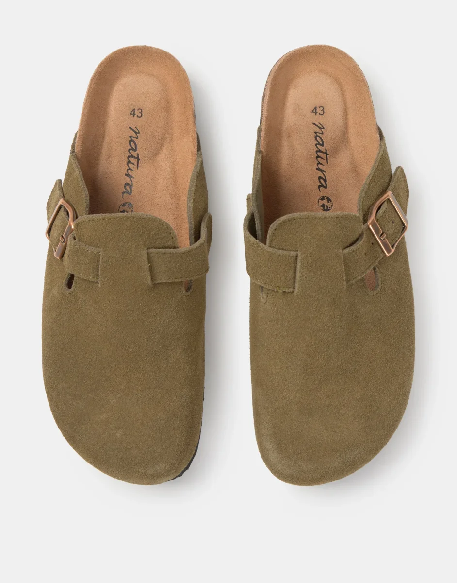 Zapato tipo zueco para hombre con diseño destalonado, corte de piel de serraje y suela de corcho. Detalle de hebilla en el corte.